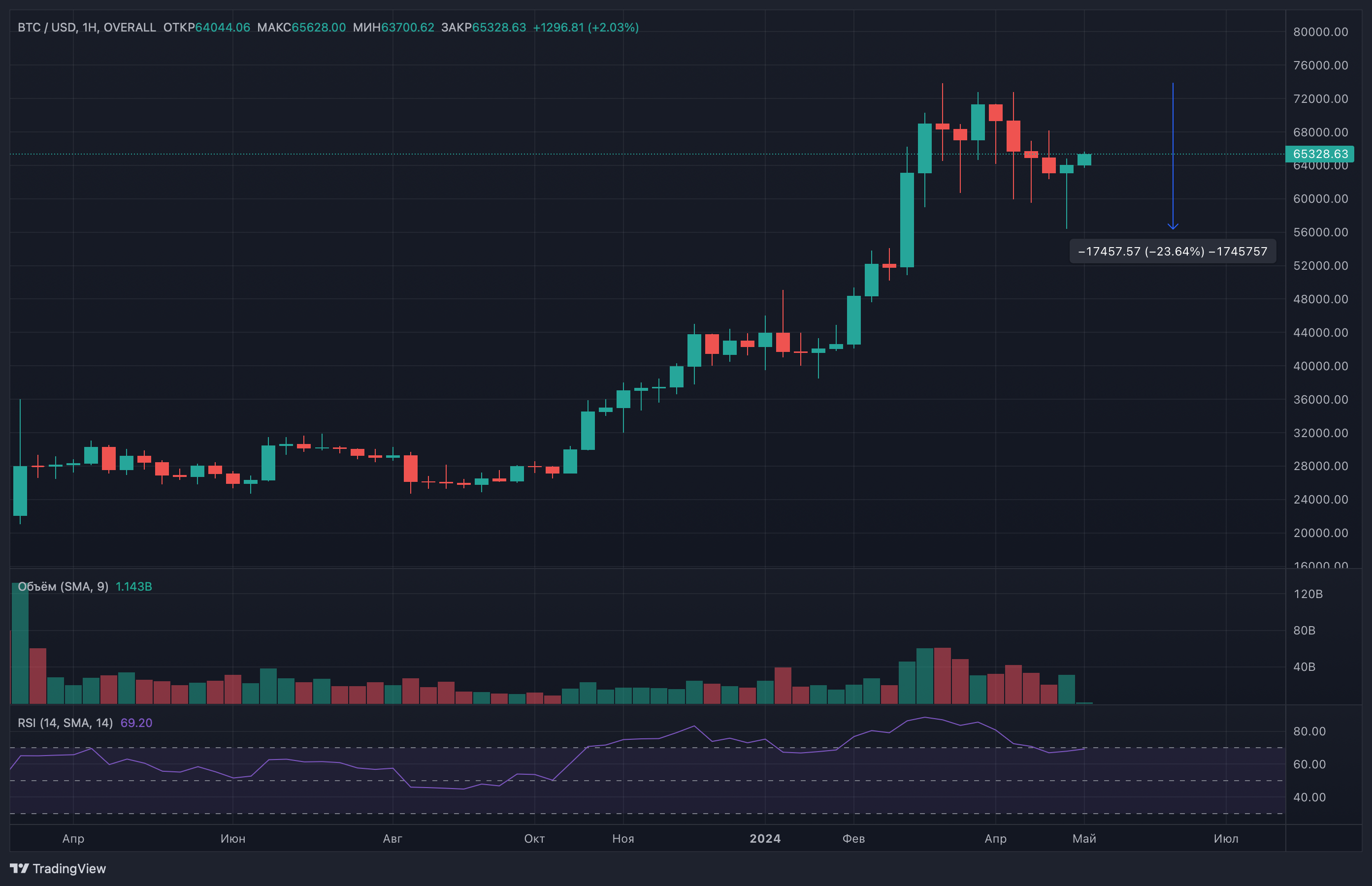По данным скринера криптовалют Cryptovizor, определяющего цену BTC/USD по результатам торгов на спотовых биржах, недельная свеча актива закрылась на отметке $64 031. На момент написания статьи курс биткоина соответствовал $65 329.