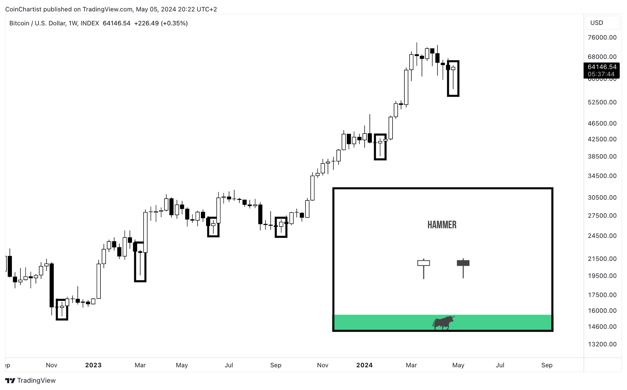 С ноября 2022 года каждое падение биткоина происходило на все более высоком уровне и сопровождалось молотом на недельном графике. Разве на этот раз по-другому?