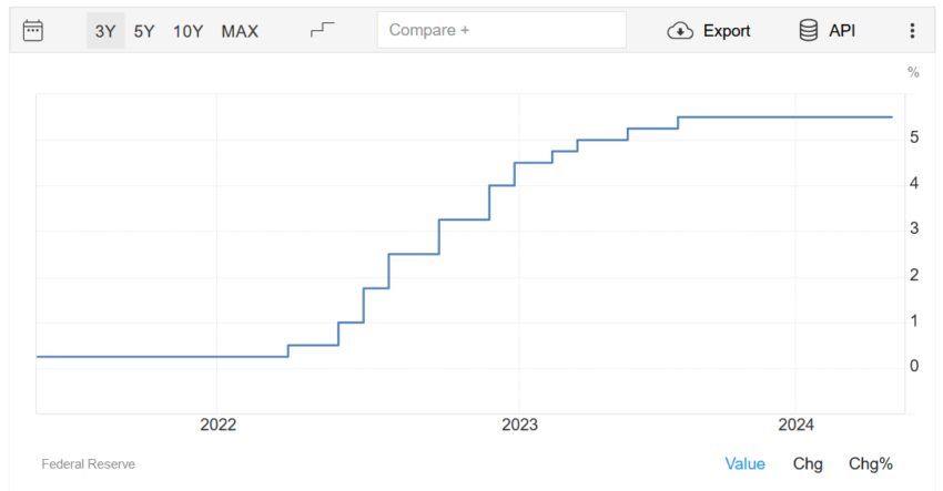 Пока процентные ставки в США находятся на рекордно высоком уровне. ФРС до сих пор борется с высокой инфляцией, вызванной пандемией COVID-19.