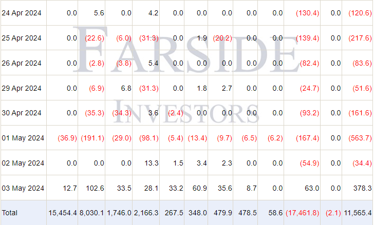 С конца прошлого месяца инвесторы устойчиво выводили средства из спотовых ETF на базе биткоина. Так, по данным Farside Investors, с 24 апреля по 2 мая из нового инструмента утекло в общей сложности $1,2 млрд.