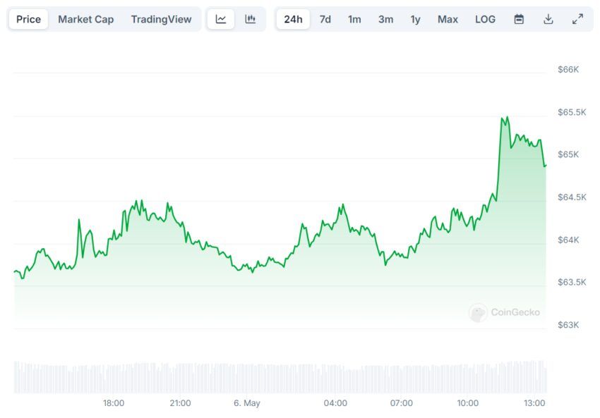 Утром 6 мая стоимость биткоина (BTC) перевалила за отметку в $65 тыс. За последние семь дней цена актива опускалась ниже $57 тыс.