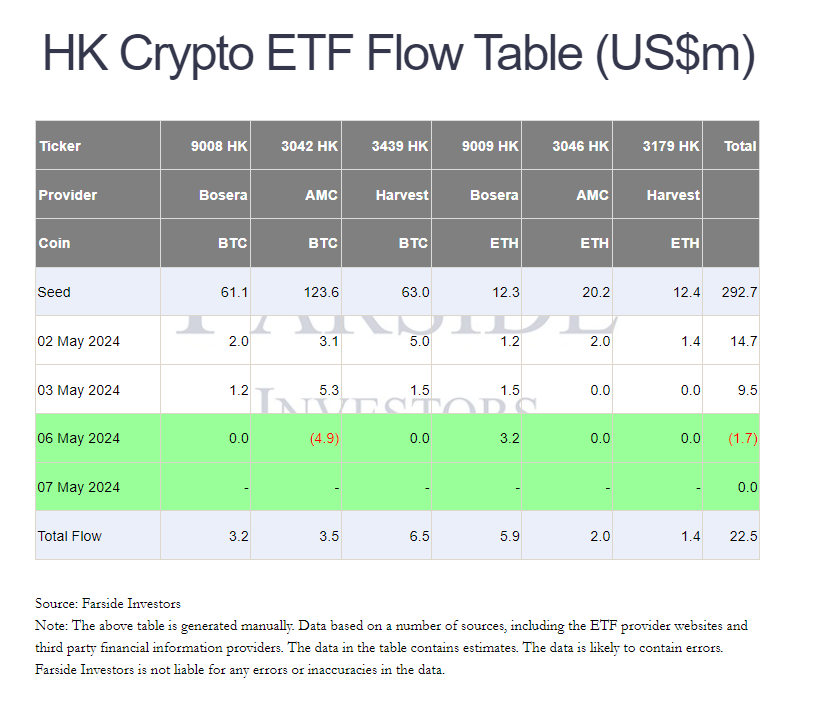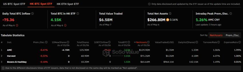 6 мая биржевые фонды в Гонконге зафиксировали первый совокупный отток средств. Причем отрицательная динамика наблюдалась только в инструменте управляющего активами ChinaAMC по первой криптовалюте — -$4,9 млн. Общий отток за вчерашний торговый день составил $1,7 млн.