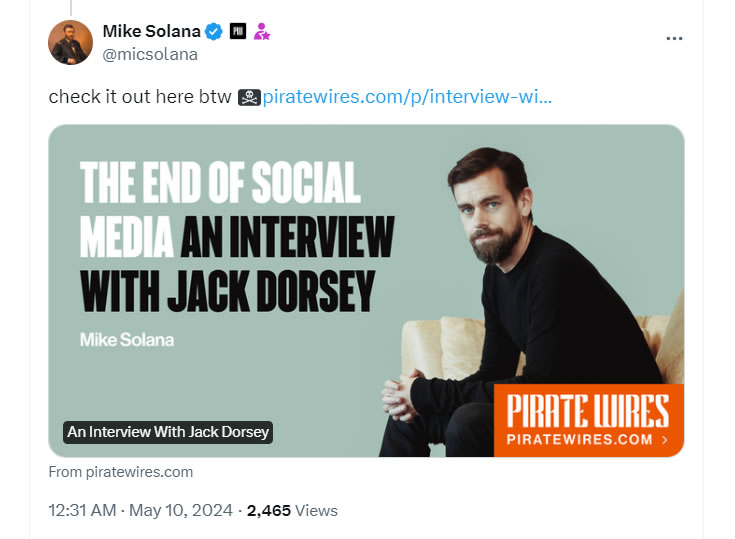 Выступая 9 мая на Pirate Wires, Дорси предложил оптимистичный прогноз относительно долгосрочного ценового движения Биткоина (BTC), а также предоставил дополнительный контекст своего внезапного ухода из совета директоров BlueSky — децентрализованной альтернативы Twitter, которую он помог запустить в 2019 году.
