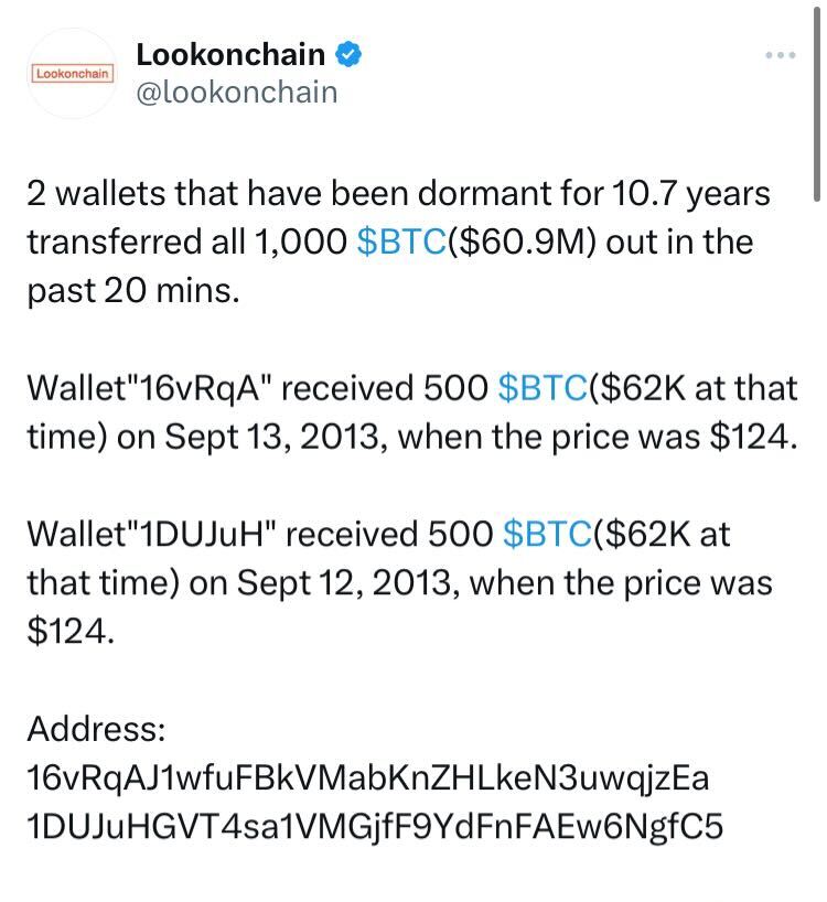 Два загадочных биткоин-кошелька, в которых в общей сложности хранится 1000 биткоинов — на сумму 61 миллион долларов в текущих ценах — внезапно проснулись после 10-летнего перерыва, переведя почти все биткоины и сатоши.