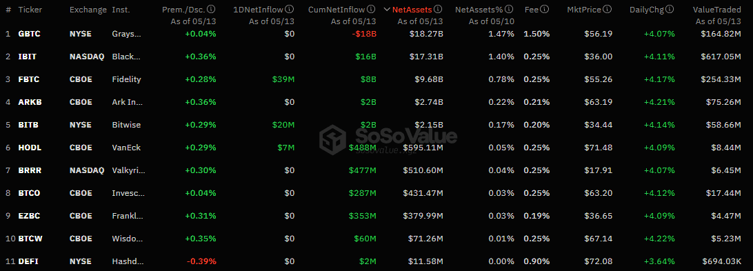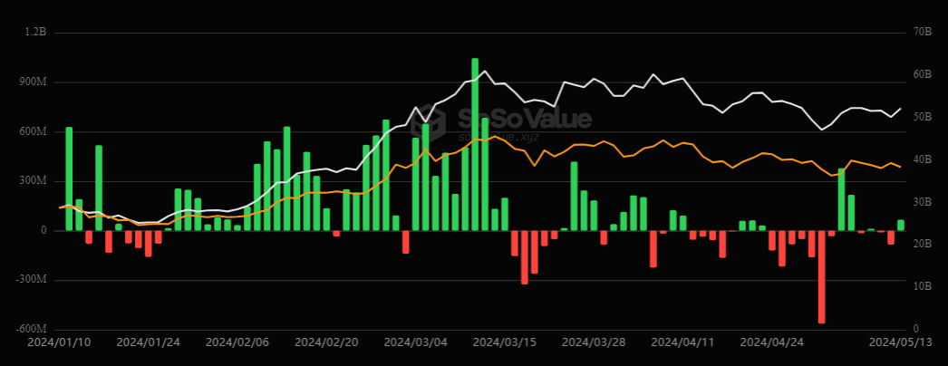 13 мая 2024 года в американском секторе спотовых биткоин-ETF зафиксирован приток капитала в размере $65,96 млн, согласно SoSo Value. Это значительно больше в сравнении с предыдущим торговым днем.