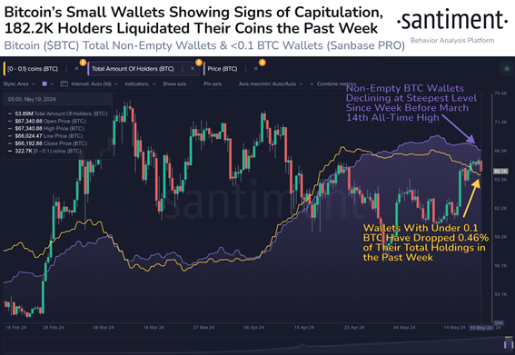 Эксперты Santiment подчеркнули, что на прошлой неделе, когда стоимость биткоина превысила $67 000, держатели кошельков, на которых хранится менее 0,1 BTC, избавились от большей части своих активов.