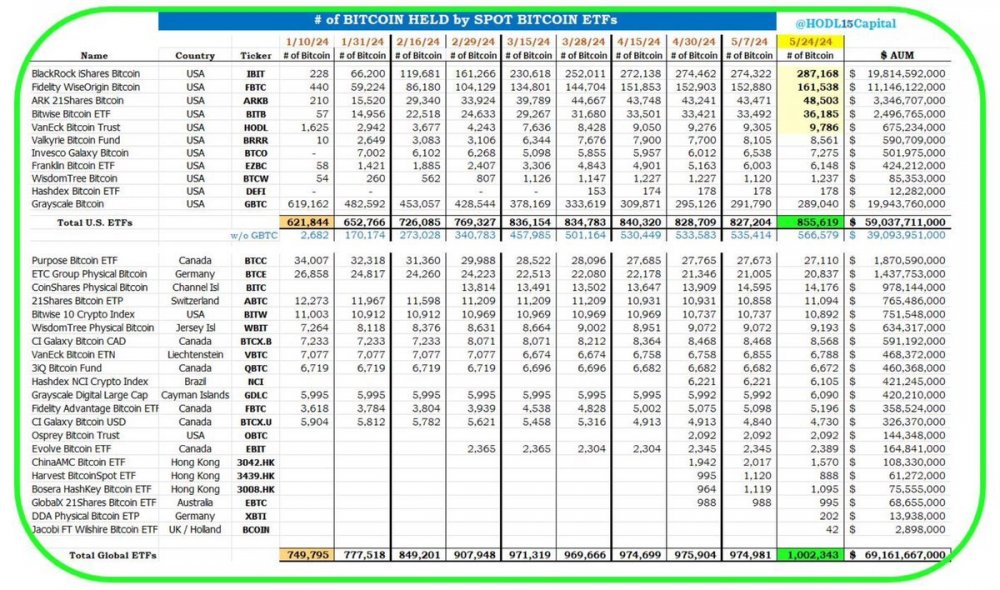 Согласно данным, предоставленным HODL15Capital, еще 21 биржевой продукт Биткоин, предлагаемый в Канаде, Германии, Бразилии и других странах, увеличивает общее количество хранящихся биткоинов до 1 002 343 BTC, что оценивается в 68 миллиардов долларов.