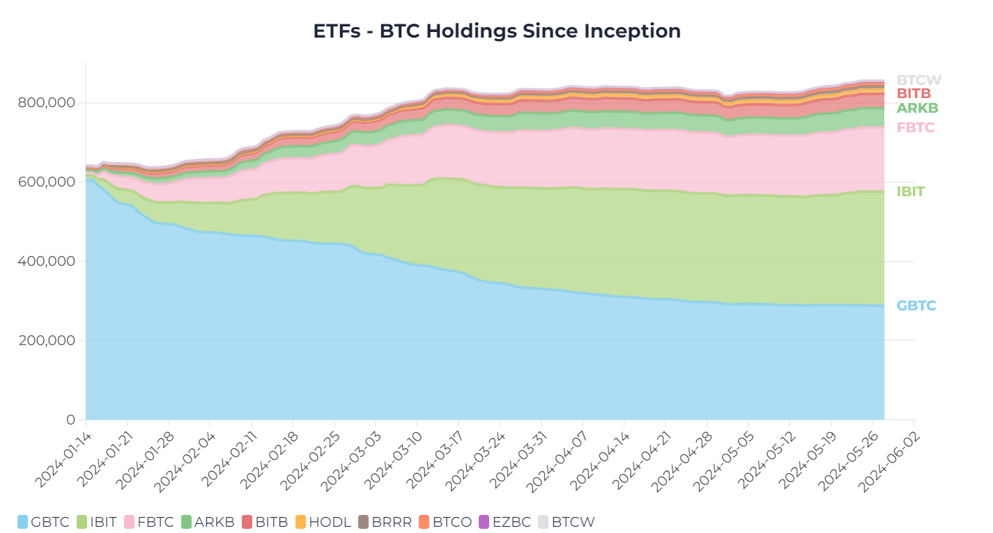 По состоянию на 28 мая, iShares Bitcoin Trust (IBIT) от BlackRock зафиксировал приток средств в размере $102,5 млн. В то же время из GBTC от Grayscale инвесторы вывели почти $105 млн.