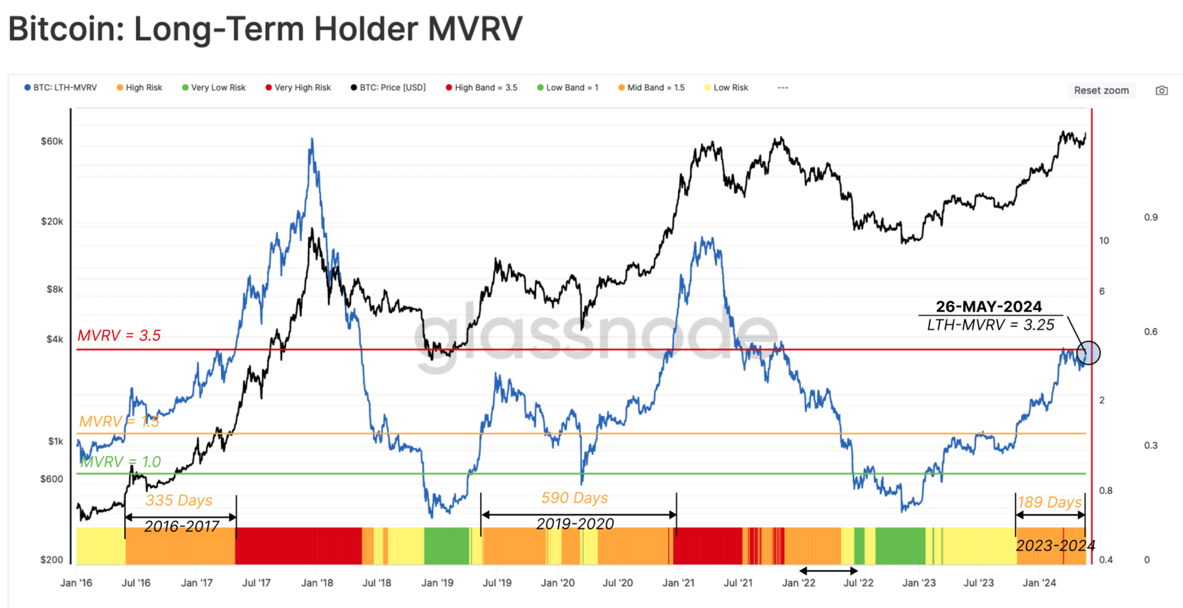 Исторически переходная фаза между медвежьим и бычьим трендом характеризуется тем, что нереализованная прибыль долгосрочных инвесторов находится в пределах значений, при которых монеты можно продать дороже от 1.5 до 3.5 раз цены их покупки. Этот период в состоянии длиться от одного до двух лет.