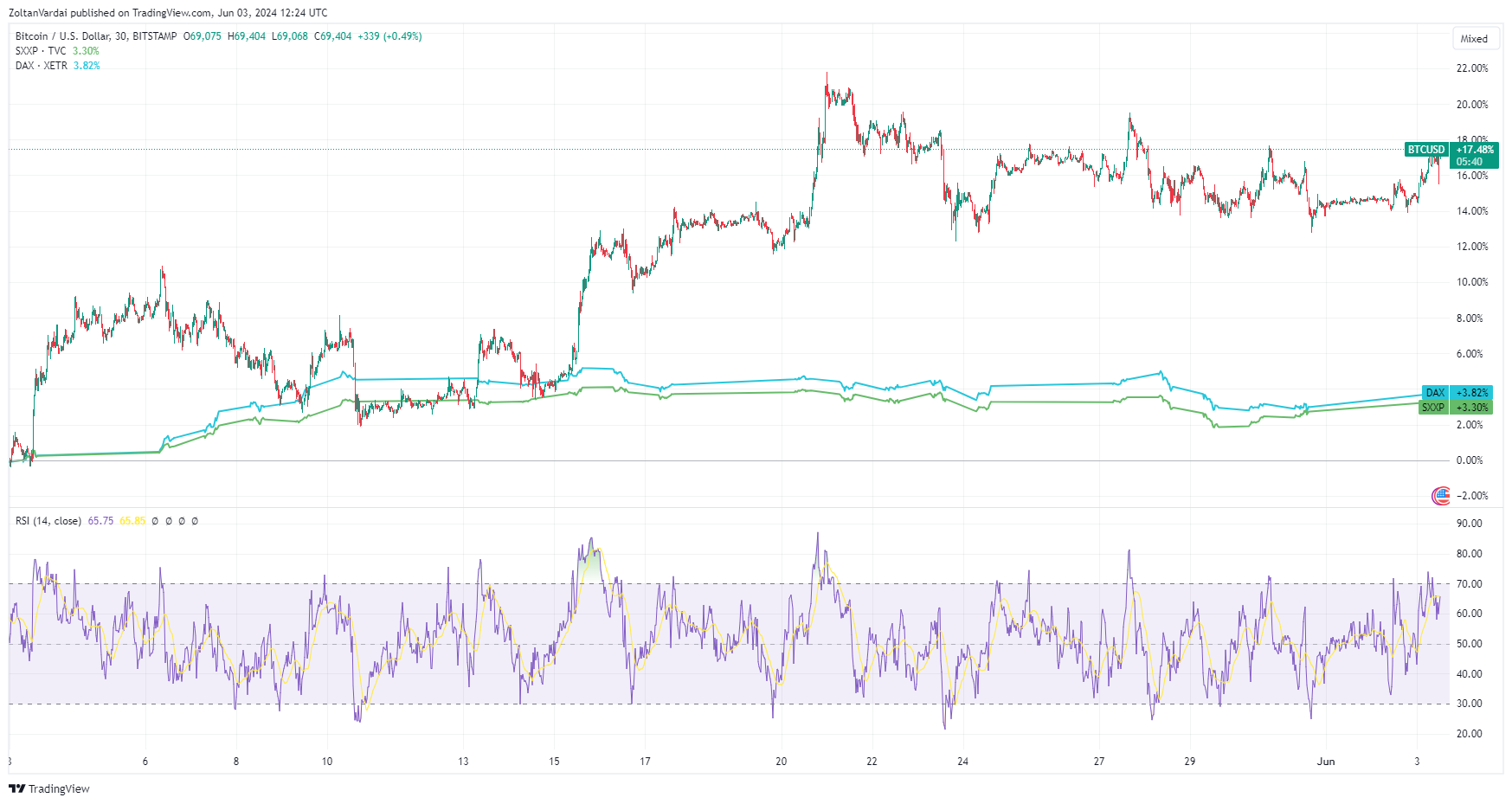 Два флагманских фондовых индекса Европы, STOXX 600 и DAX 40, выросли в мае вместе с ценой Биткоина. По данным BitStamp, индекс STOXX 600 вырос более чем на 3,3%, а DAX 40 — более чем на 3,8% за последние 30 дней, когда цена BTC выросла более чем на 17,4%.