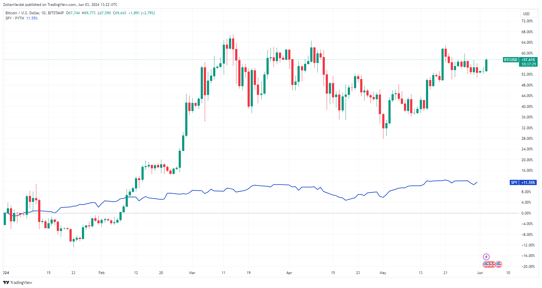 BTC и S&P 500, с начала года. Источник: TradingView.