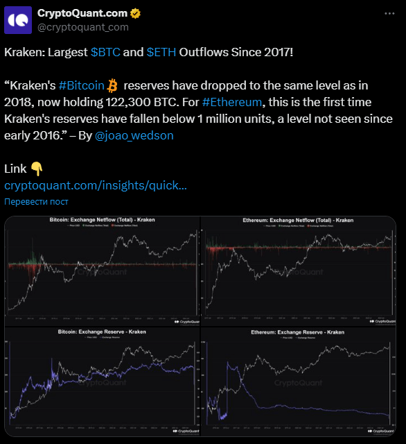 Данные, опубликованные Cryptoquant, показывают, что одна из ведущих криптовалютных бирж на рынке Kraken стала свидетелем крупнейшего оттока биткоина и эфира с 2017 года.