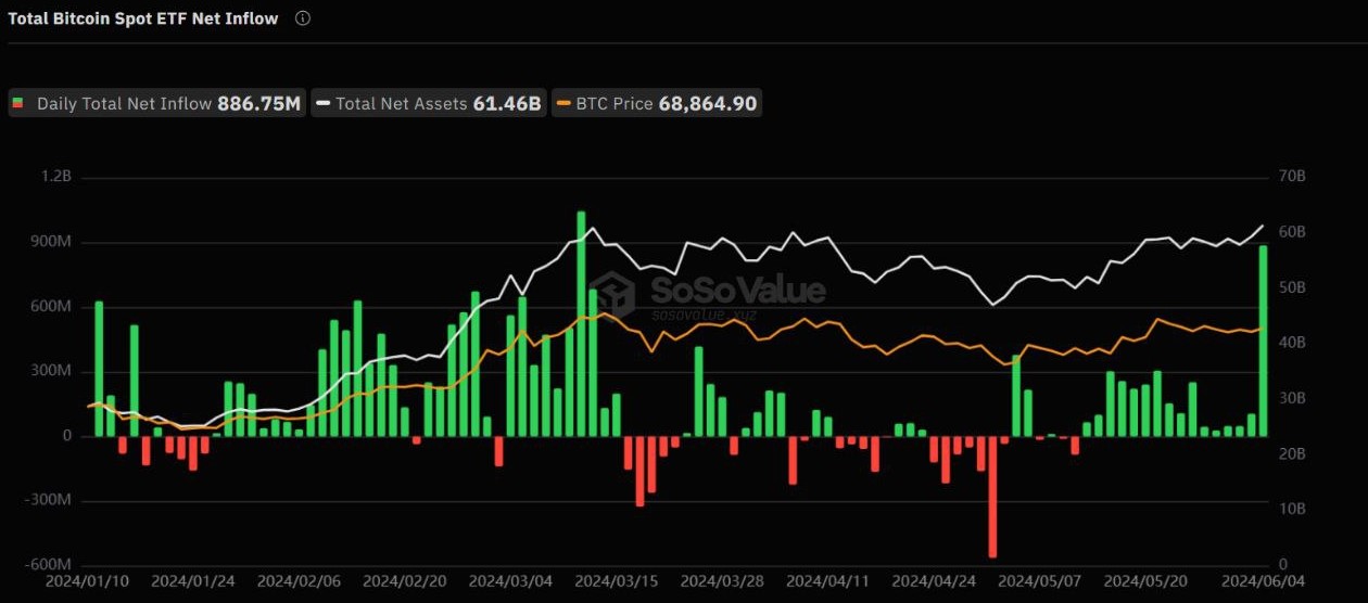 Приток капитала в американские спотовые биржевые биткоин-фонды составил $887 млн по результатам торговой сессии 4 июня. Это самый высокий показатель с марта месяца, а также второй по величине суточный приток инвестиций в истории биткоин-фондов. Рекордный по объему приток средств в спотовые биткоин-ETF — более $1 млрд — был зафиксирован по результатам торговой сессии 12 марта.