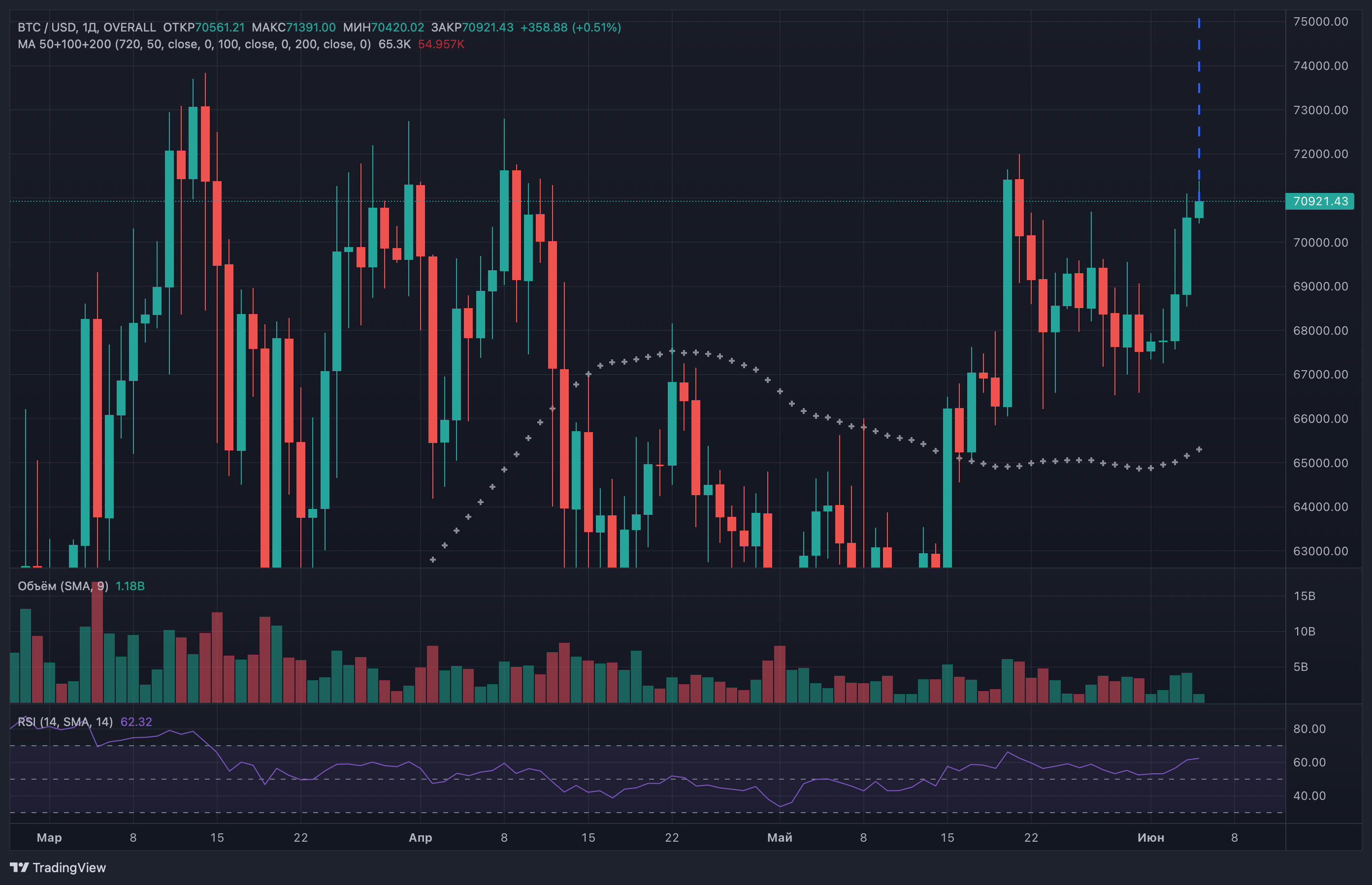 По данным скринера криптовалют Cryptovizor, определяющего цену BTC/USD по результатам торгов на спотовых биржах, 5 июня актив достиг двухнедельного максимума на отметке $71 391.