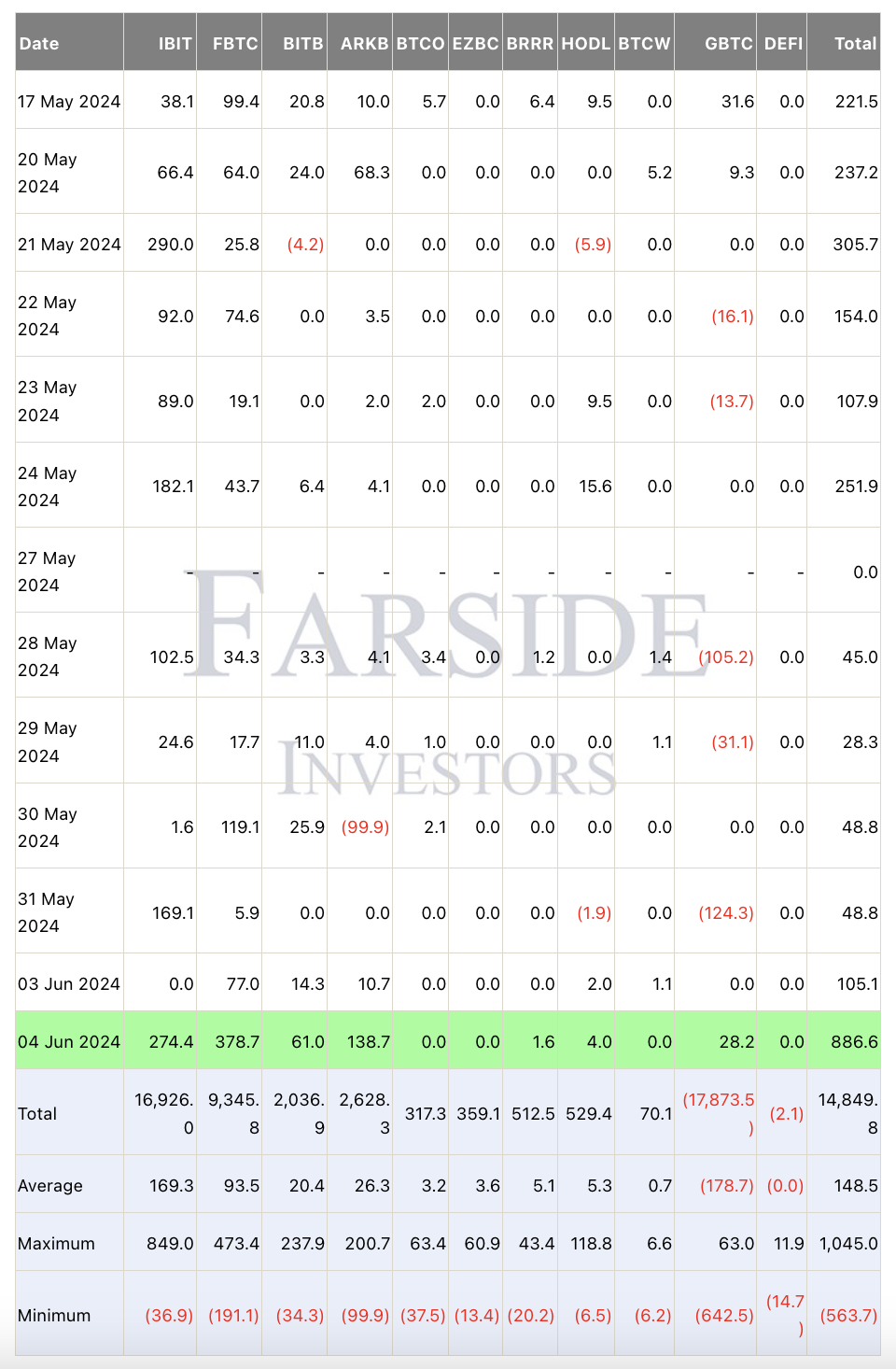 Одновременно аналитическая компания Farside зарегистрировала резкий приток средств в американские биткоин-ETF, который по итогам 4 июня приблизился к $900 млн.