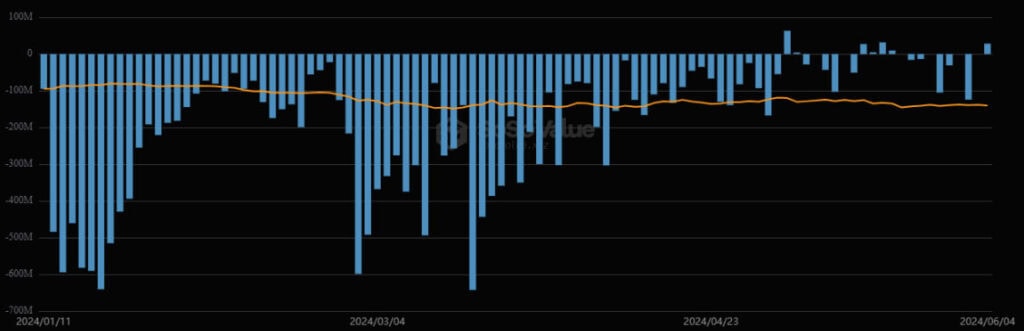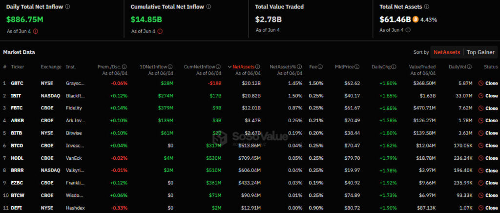 4 июня 2024 года в американском секторе спотовых биткоин-ETF зафиксирован приток средств в размере $886,75 млн, согласно SoSo Value. Это второй самый большой показатель с момента запуска биткоин-фондов. Рекорд по притоку капитала зафиксировали 12 марта, тогда спотовые ETF получили $1,05 млрд.