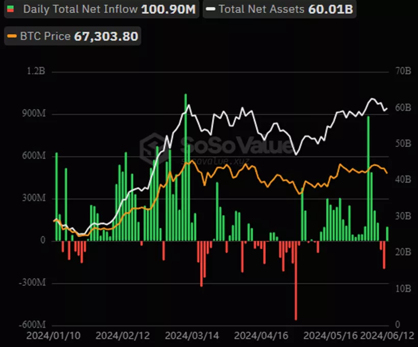 12 июня поступления в спотовые биткоин-ETF составили $100,9 млн. За предыдущие два дня инвесторы вывели из продуктов $265 млн, согласно SoSoValue.