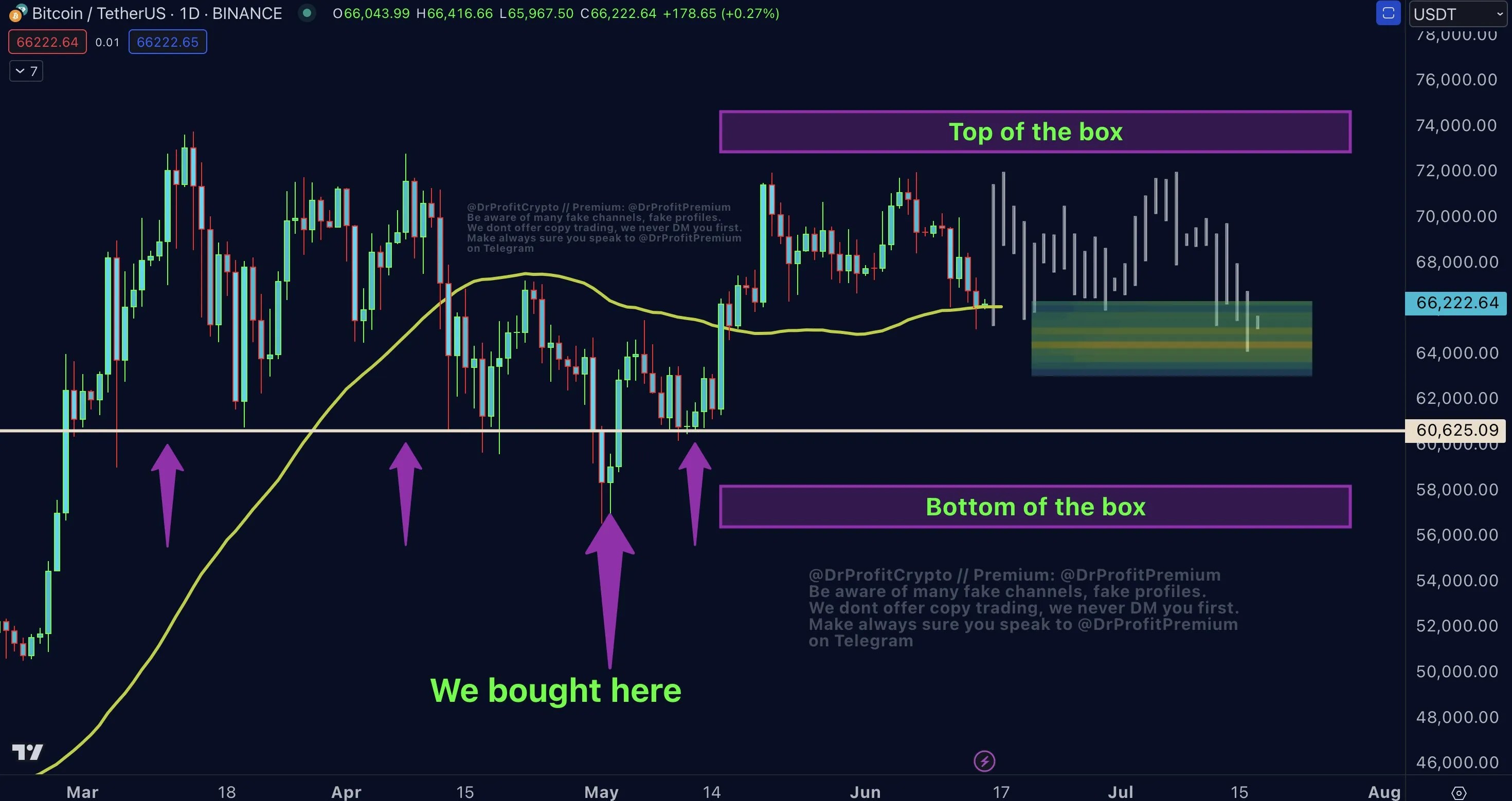 Трейдер Doctor Profit считает, что биткоин находится в зоне долгосрочной покупки. Он напомнил подписчикам, что на пути к $70 000 BTC много раз двигался в боковике и выходил в коррекции. Такое поведение актива трейдер считает нормальным.