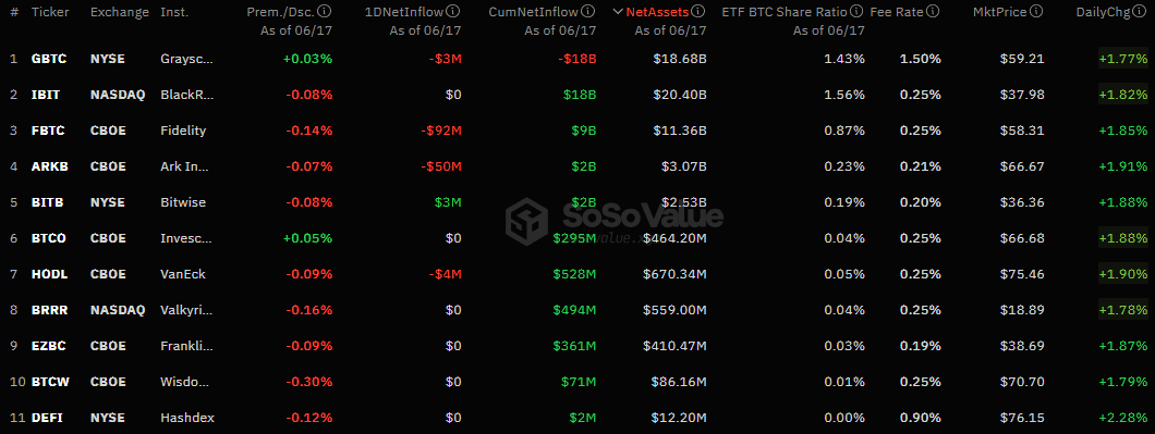- 17 июня сектор спотовых биткоин-ETF отметился просадкой.