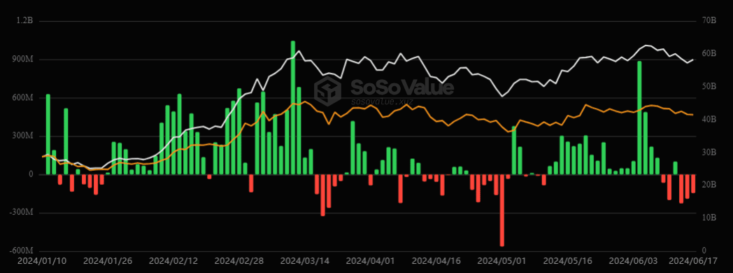 17 июня 2024 года в американском секторе спотовых биткоин-ETF зафиксирован отток капитала в размере $145,83 млн, согласно SoSo Value. Отрицательная динамика в секторе прослеживается третий торговый день подряд.