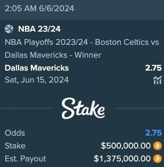 «Маверикс, потому что я Техасский Нефтяник», — написал Дрейк под скрином, намекнув на еще одну ставку от 6 июня.