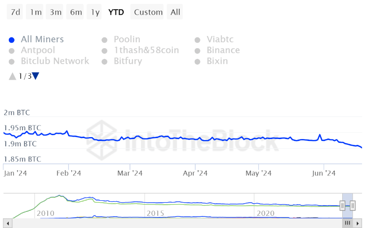 По данным аналитической платформы IntoTheBlock, количество биткоинов, хранящихся у майнеров, упало до самого низкого уровня более чем за 14 лет. Если в начале 2024 года их резервы составляли 1,95 млн BTC, то по состоянию на 19 июня они равнялись всего 1,90 млн BTC.