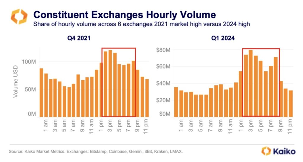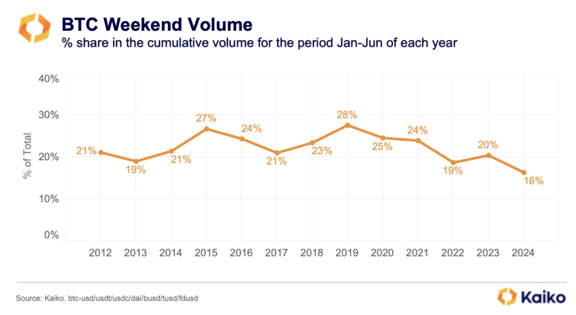В 2024 году объем торгов биткоинами в выходные дни, когда фондовый рынок не работает, снизился до 16%, согласно отчету экспертов Kaiko. Падение активности продиктовано ростом спроса на спотовые ETF на базе актива, отметили в организации.