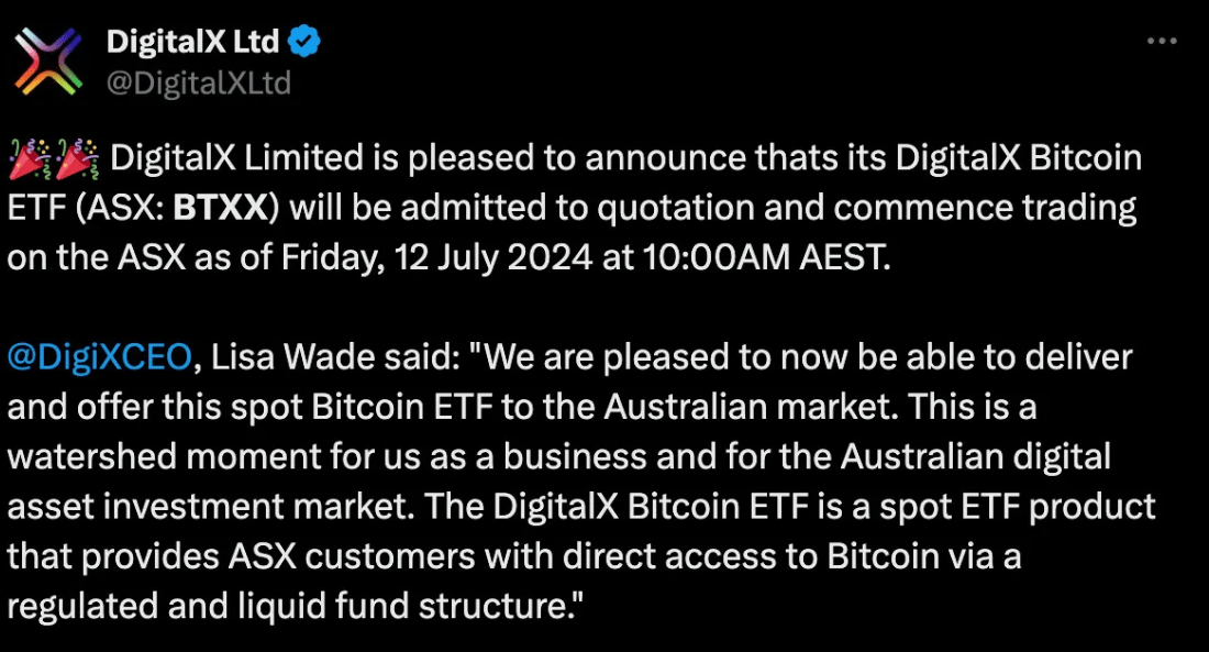 Регулятор Австралия одобрил второй спотовый биткоин-ETF, на этот раз от управляющего активами DigitalX, созданный в партнёрстве с 3iQ и K2. Продукт будет торговаться на Австралийской бирже ценных бумаг (ASX) под тикером BTXX.