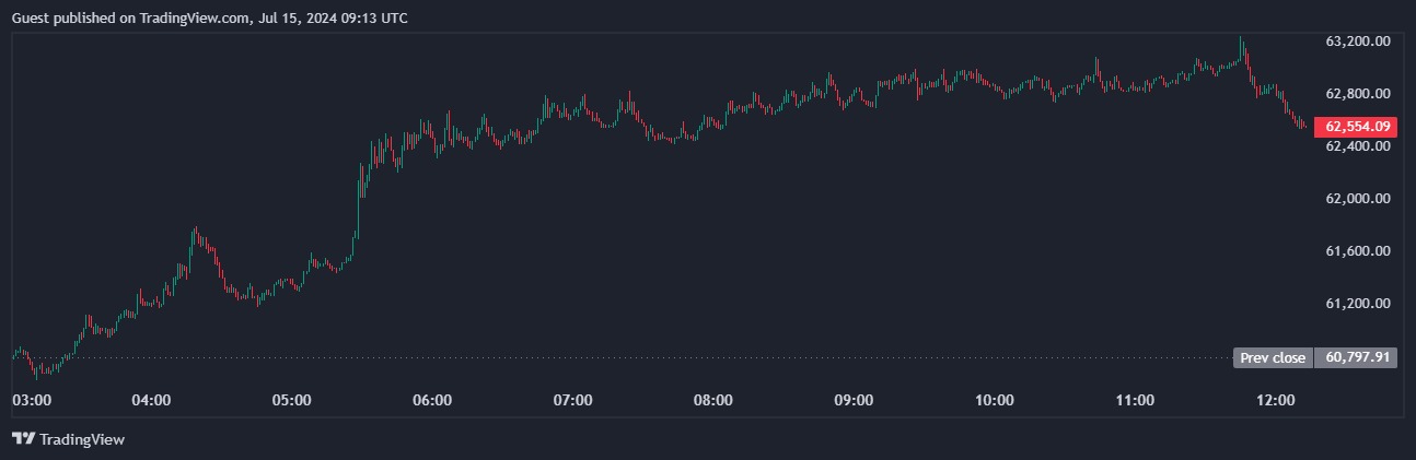Напомним, в ночь на 15 июля 2024 года биткоин отметился приростом. На момент написания актив торгуется около $62 554.