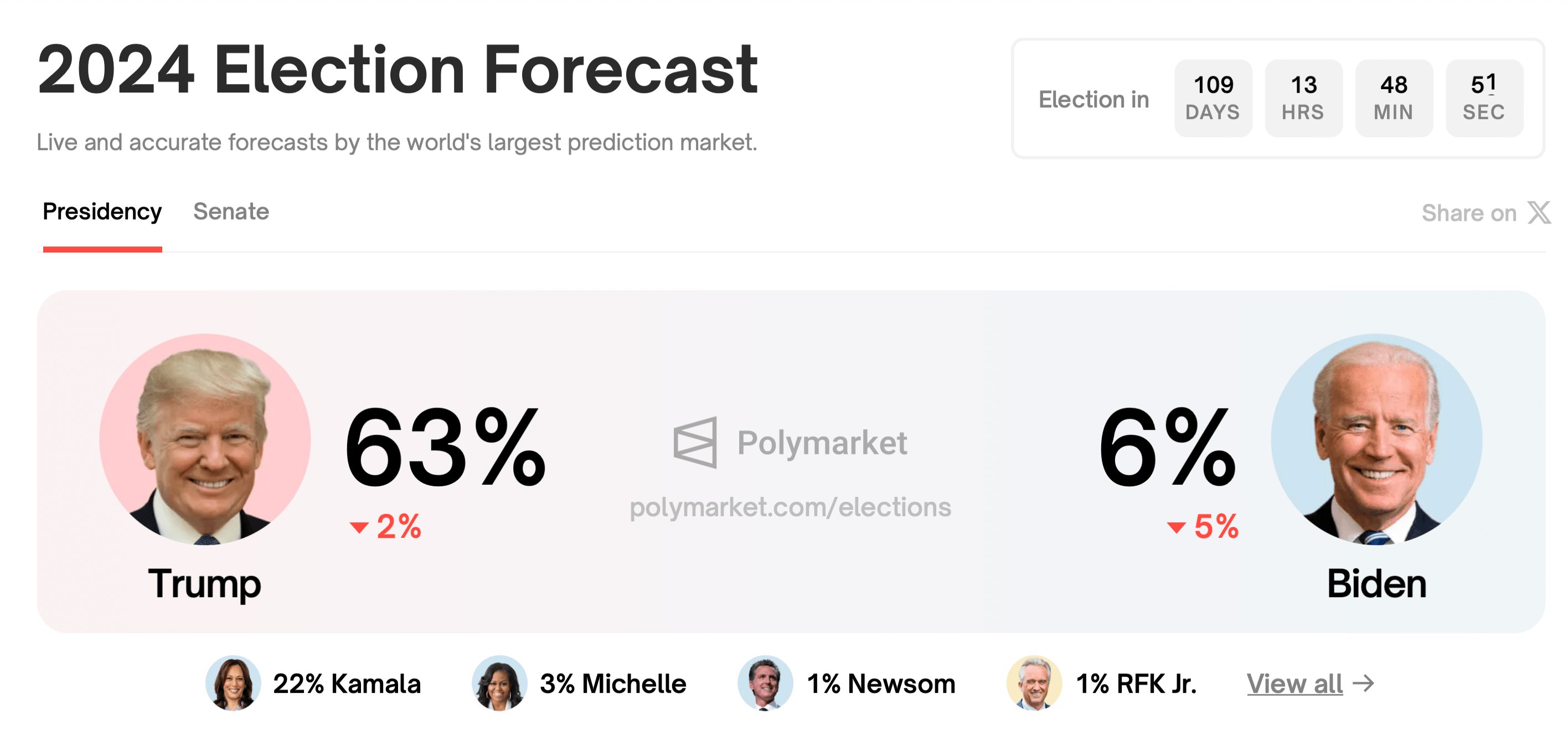 С учётом происходящего пользователи платформы Polymarket оценивают шансы победы Дональда Трампа в 63 процента, тогда как соответствующий показатель Байдена составляет всего 6 процентов.