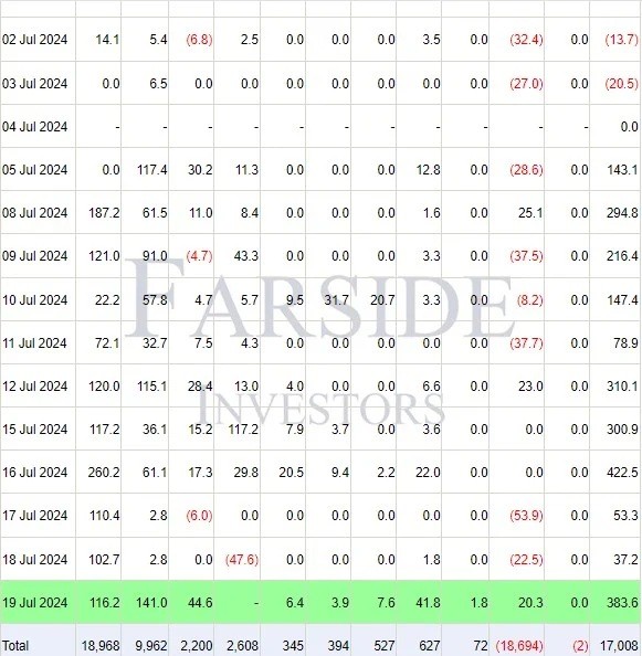 За последние две недели приток IBIT достиг $1,2 млрд, что составляет 50% от общих вливаний в одиннадцать спотовых фондов за этот период. По этой причине фонд остаётся крупнейшим спотовым биткоин-ETF с активами под управлением почти на $22 млрд по состоянию на 19 июля.