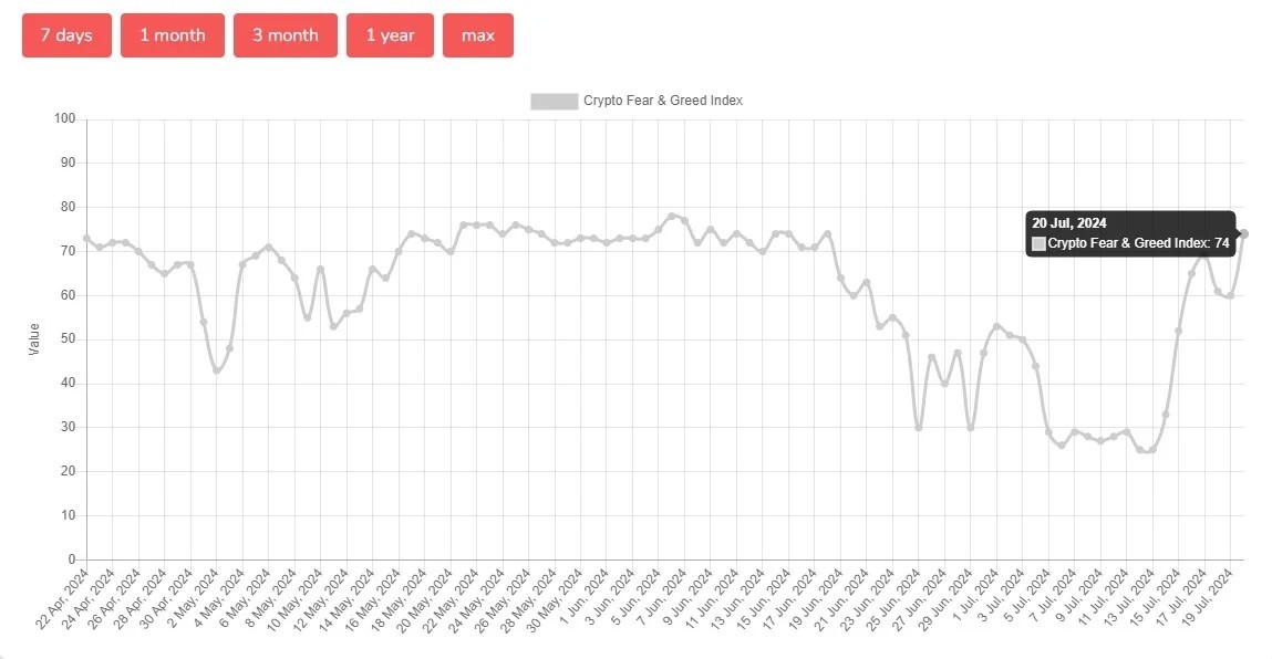 Данные Alternative.me показывают, что в субботу индекс страха и жадности криптовалют поднялся на 14 пунктов до 74. По данным TradingView, рост индекса произошёл после того, как в пятницу вечером цена биткоина (BTC) достигла локального максимума в $66 800.
