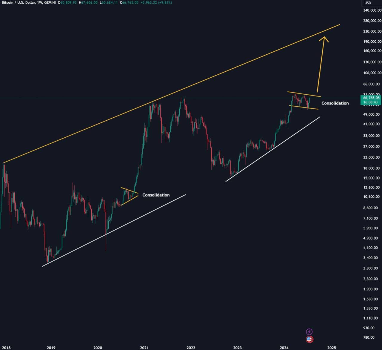 Позитивный прогноз курса биткоина также дал трейдер Titan of Crypto. Он считает, что закрытие предыдущей недели выше $65 100 открывает перед криптовалютой путь роста к уровням выше $100 000. Судя по графику, который опубликовал трейдер, инвесторы смогут увидеть биткоин на обозначенной высоте осенью 2024 года.