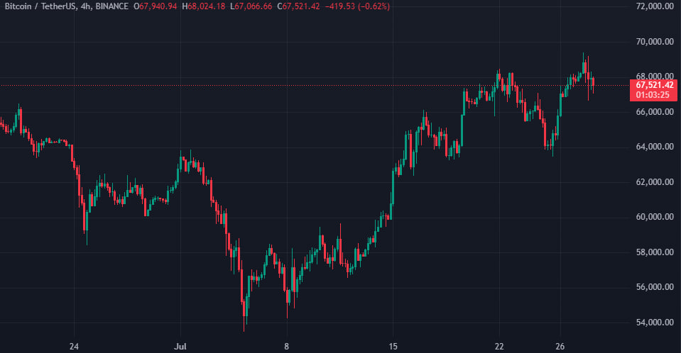Отметим, во время речи Трампа биткоин колебался в диапазоне от около $66 600 до $69 200: