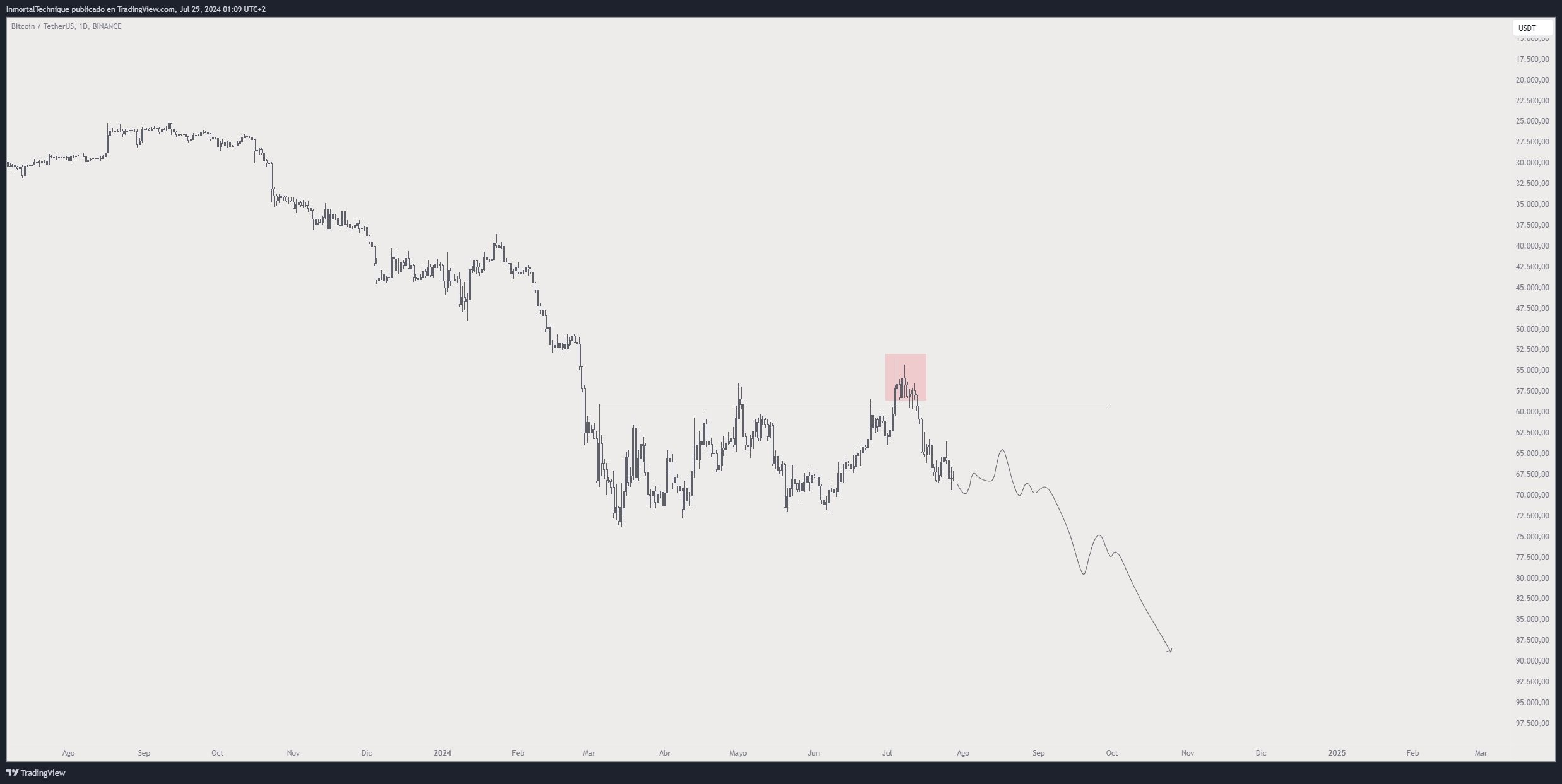 Позитивный прогноз биткоина также дал аналитик Inmortal. Он обозначил предполагаемую траекторию движения BTC на перевернутом графике. По его мнению, BTC сможет обновить абсолютный максимум осенью этого года. При этом аналитик не исключает риски коррекции криптовалюты перед возобновлением роста.
