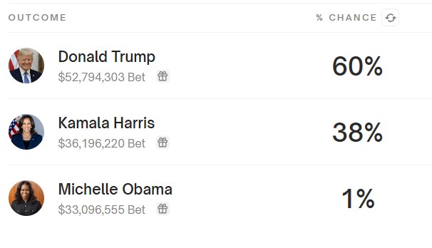Прогноз исхода президентских выборов США 2024. Источник: Polymarket
