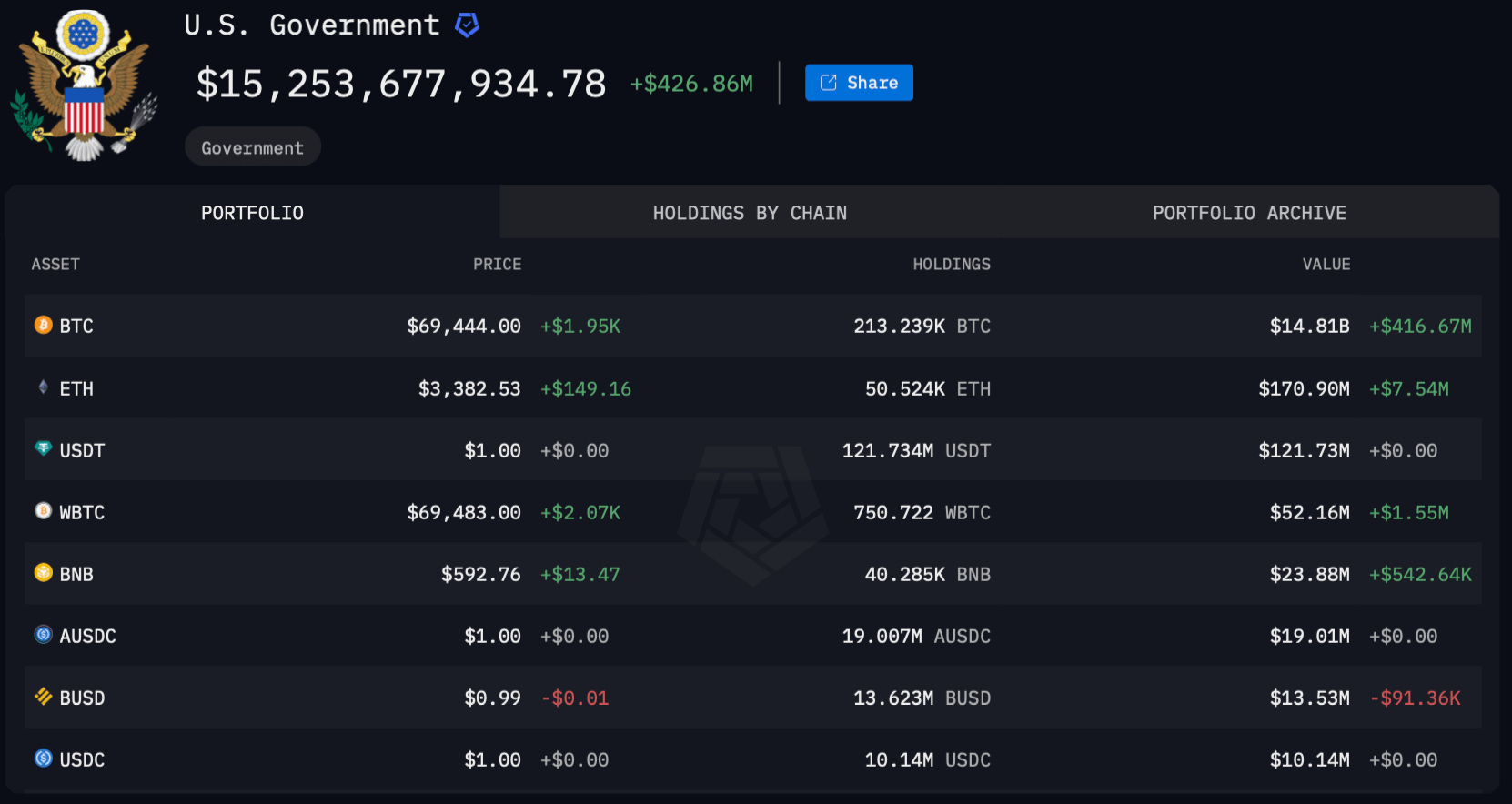 По информации платформы Arkham, сегодня на кошельках американского правительства удерживается 213 239 BTC общей стоимостью 14.81 миллиарда долларов.