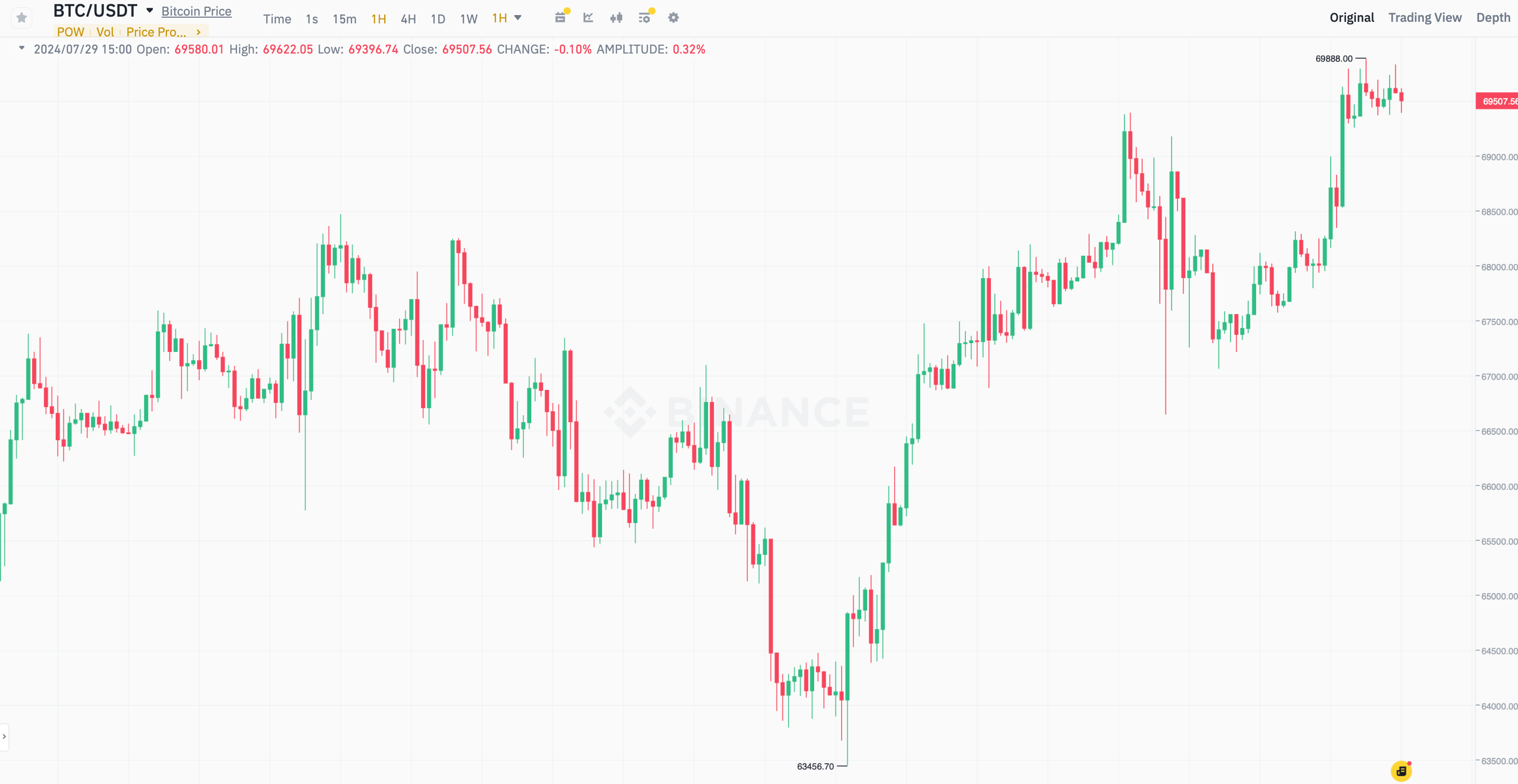 Изменения курса Биткоина на часовом графике криптовалюты