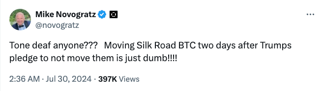 Правительство США перевело биткоины на сумму 2 миллиарда долларов, что один комментатор назвал «глухотой», так как это произошло всего через два дня после того, как во время выступления на конференции Bitcoin 2024 в Нэшвилле, штат Теннесси, бывший президент Дональд Трамп пообещал, что США никогда не продадут свои биткоины.