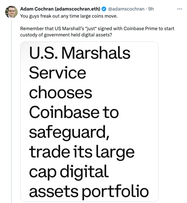 Между тем несколько крипто-комментаторов предполагают, что перевод может быть связан с соглашением от 1 июля между криптовалютной биржей Coinbase и Службой маршалов США, которые подписали соглашение о «защите» криптоактивов правительства США.