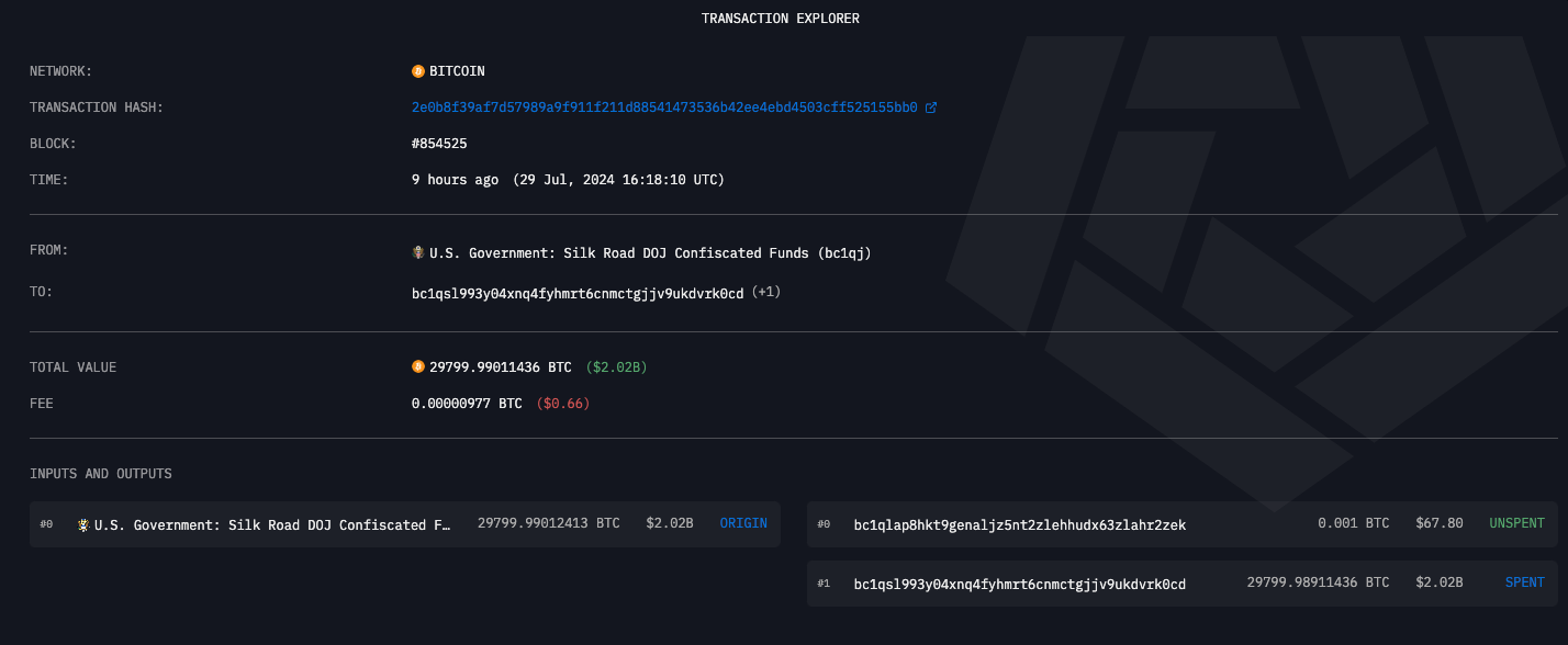 Согласно данным платформы анализа блокчейнов Arkham Intelligence, правительственный кошелек, в котором хранились биткоины, изъятые с закрытого рынка даркнета Silk Road в 2022 году, перевел 29 800 BTC на неизвестный адрес кошелька 29 июля.