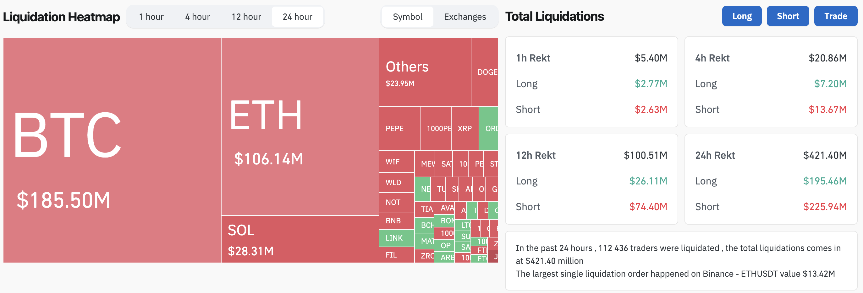 По данным Coinglass, за последние сутки сумма ликвидаций составила $421 млн. Из этого значения на биткоин-трейдеров пришлось $185 млн.