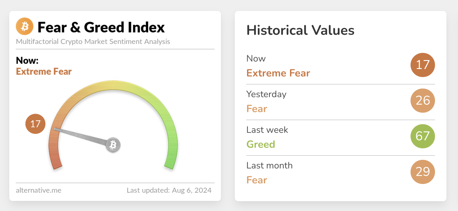 Индекс страха и жадности на крипторынке в настоящий момент составляет 17 пунктов и находится в зоне «чрезвычайного страха».