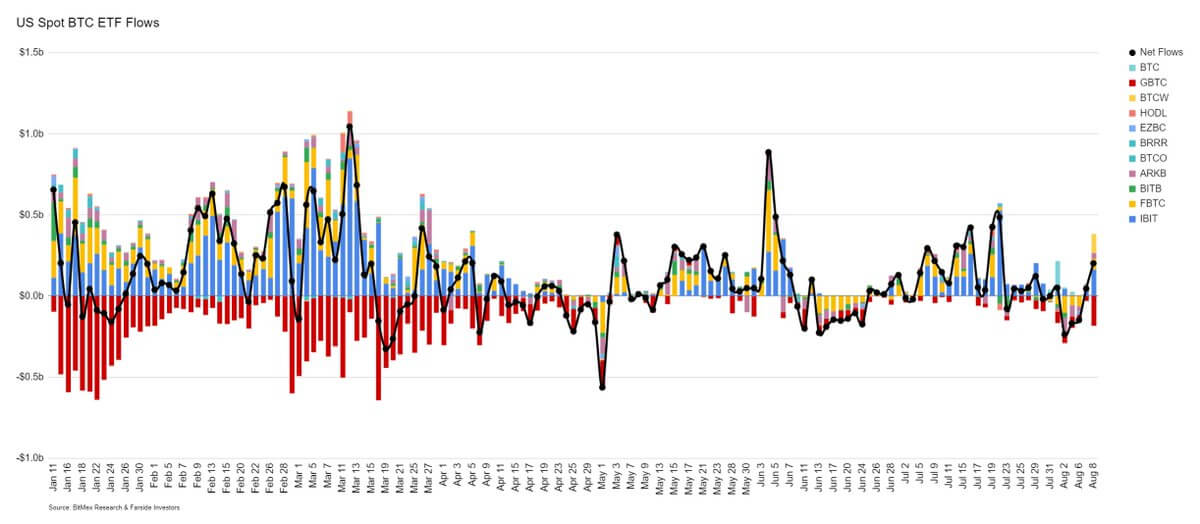 Росту BTC в том числе способствовал наплыв капитала в спотовые ETF на основе криптовалюты в США. За вчера они зафиксировали чистый приток 201.5 миллиона долларов, что стало лучшим результатом с 19 июля.