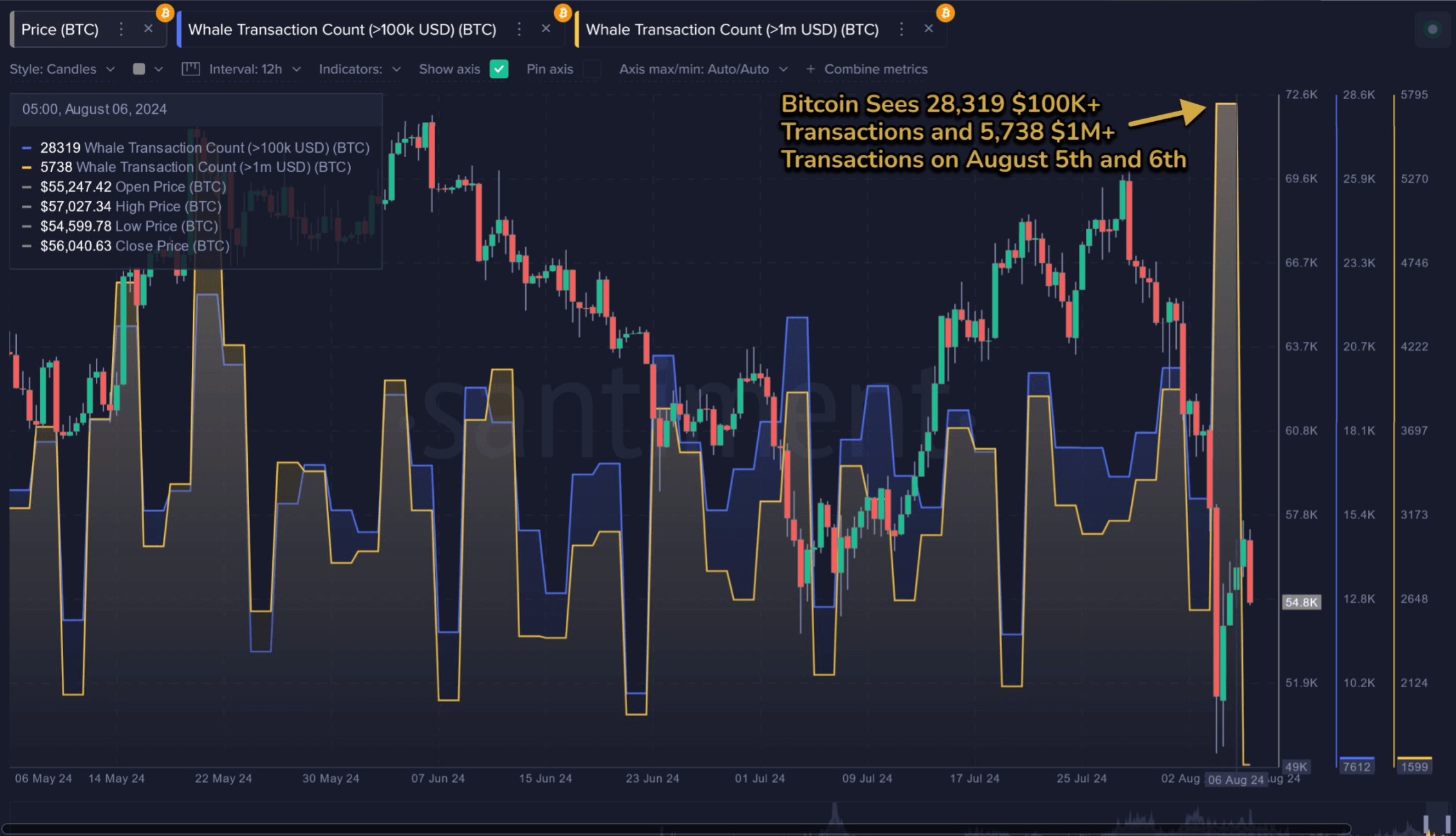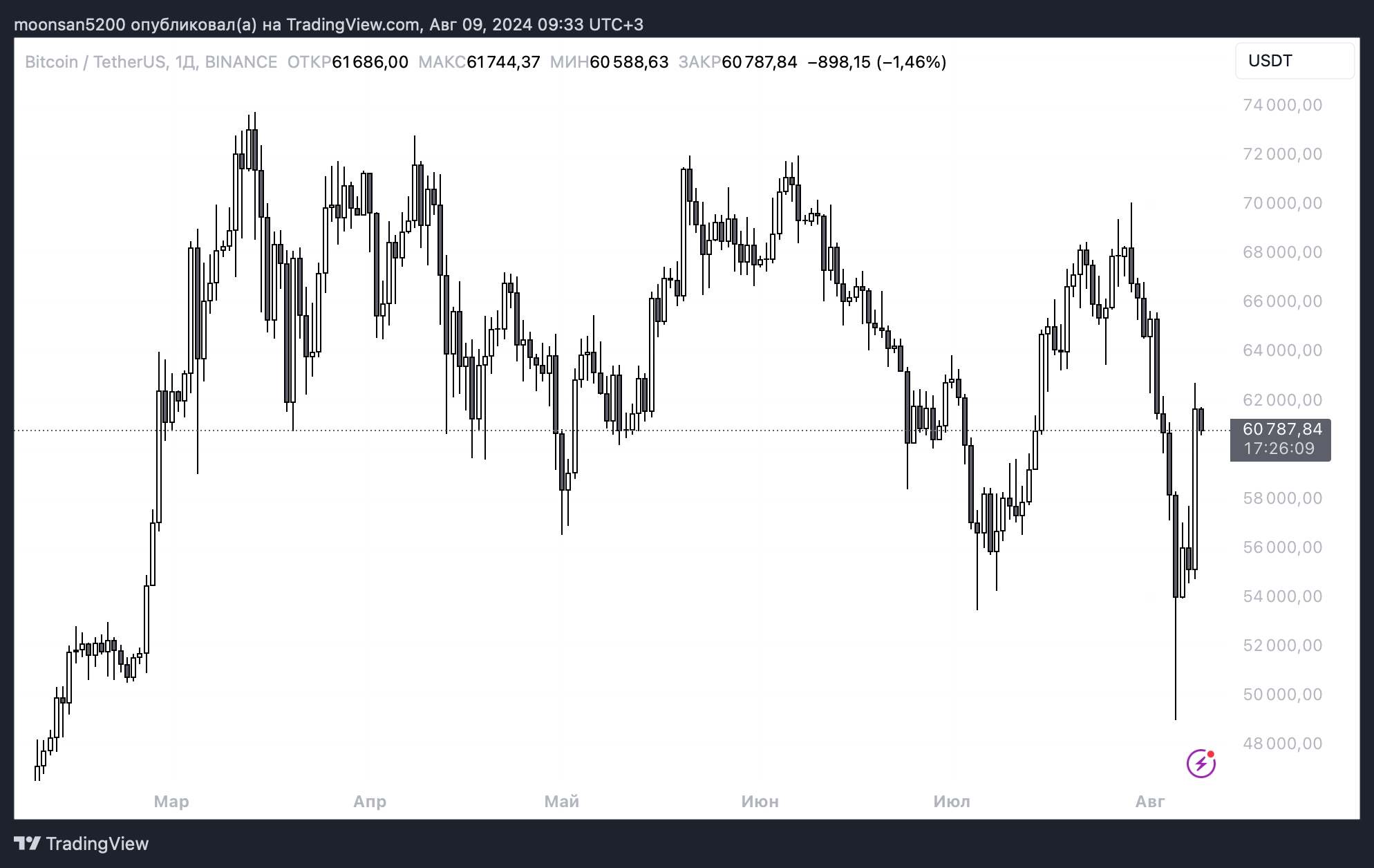 5 августа Биткоин подешевел примерно на 18 процентов, упав с отметки чуть более 60 тысяч долларов до уровня 49 тысяч менее чем за сутки. Основная фаза коррекции пришлась как раз на пиковую активность китов.