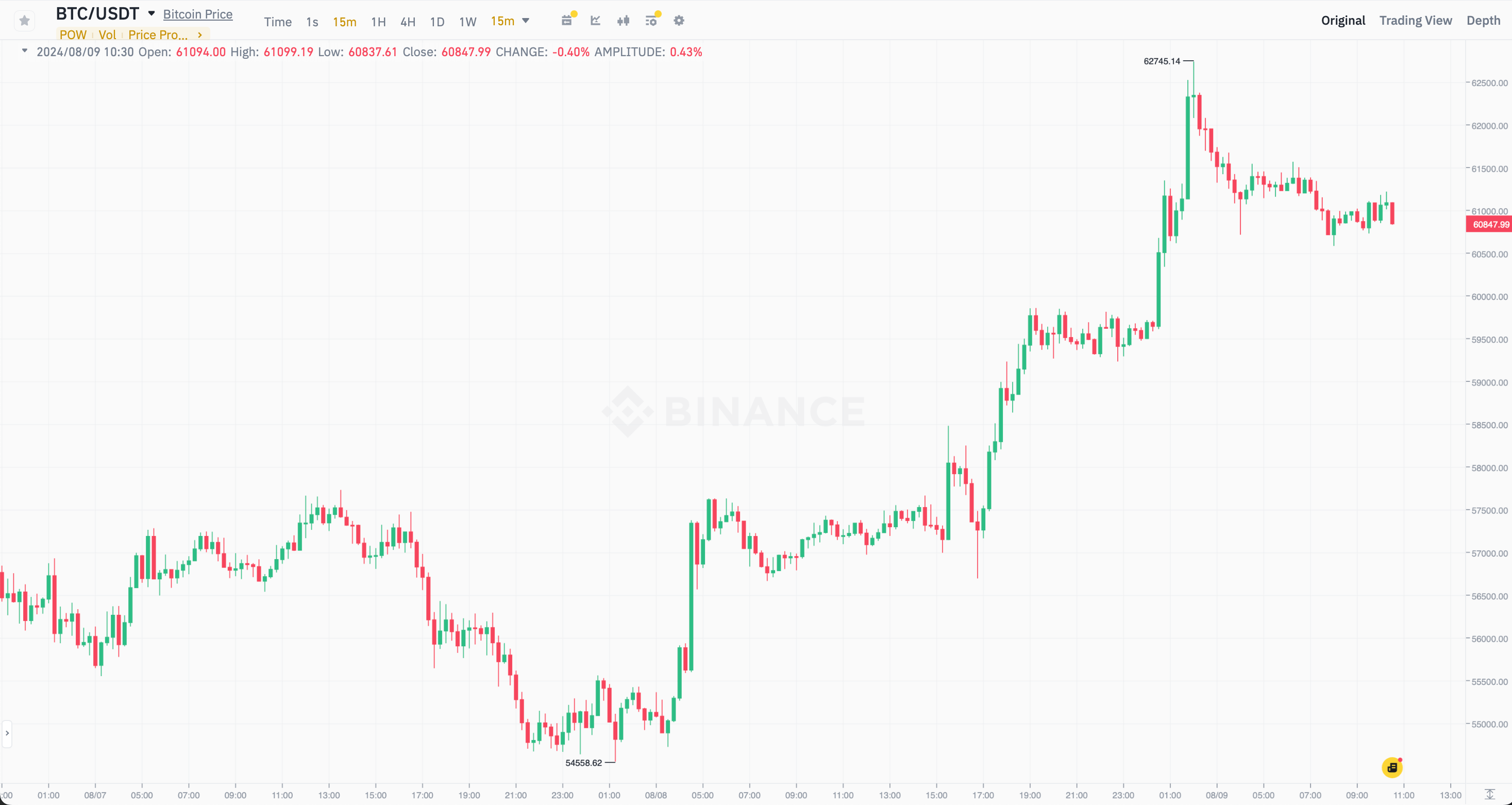 За последние сутки Биткоин вырос на 6.2 процента, благодаря чему сейчас он находится чуть ниже уровня 61 тысячи долларов. Вот 15-минутный график курса первой криптовалюты.