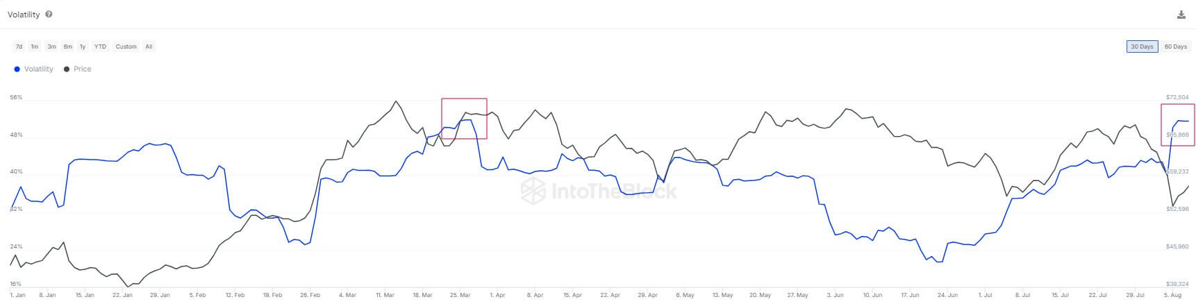 Также на фоне резких изменений курса Биткоина его волатильность прыгнула до максимума с марта. То есть стоимость криптовалюты в последнее время меняется очень резко, что говорит о неопределённости в индустрии.