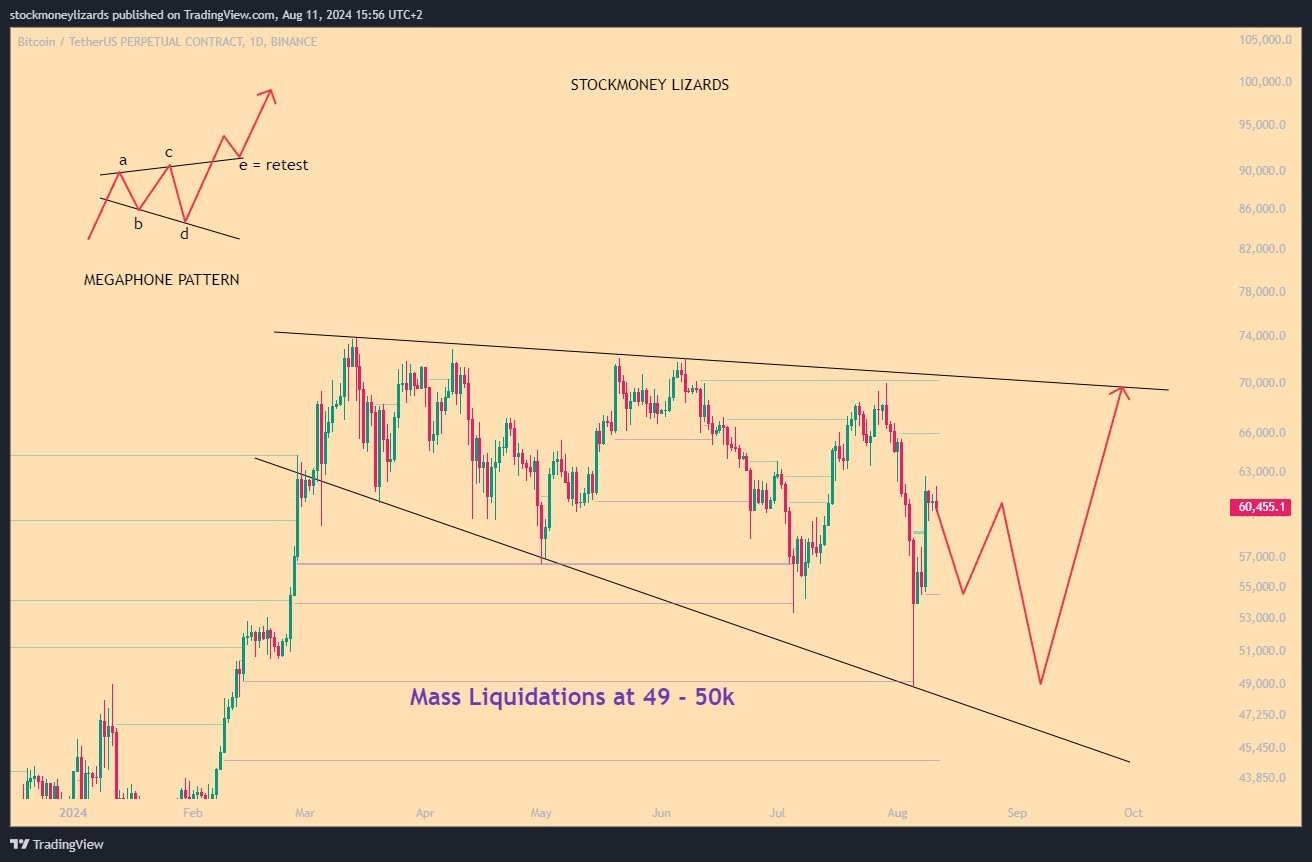 Прогноз биткоина, согласно которому в ближайшее время криптовалюта может подешеветь, поддержал трейдер Stockmoney Lizards. По его мнению, на графике криптовалюты просматривается паттерн «мегафон». Движение в теле фигуры, как считает трейдер, может обернуться очередным падением BTC в район $49 000. При этом в долгосрочной перспективе, уверен Stockmoney Lizards, «мегафон» выведет биткоин к новым максимумам. Летнюю коррекцию BTC трейдер назвал типичным поведением криптовалюты.