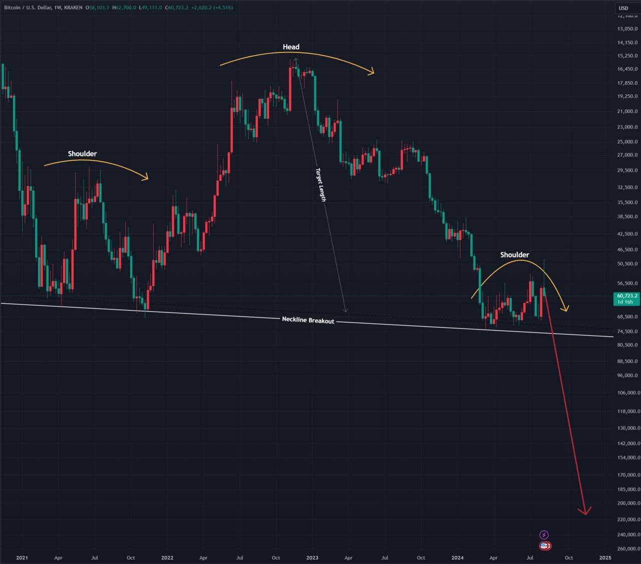 Sensei напротив считает, что BTC уже прошел все локальные минимумы. По его мнению, впереди, после завершения фигуры технического анализа «голова и плечи», биткоин ждет исключительно рост. Предполагаемую траекторию движения криптовалюты он обозначил на перевернутом графике.