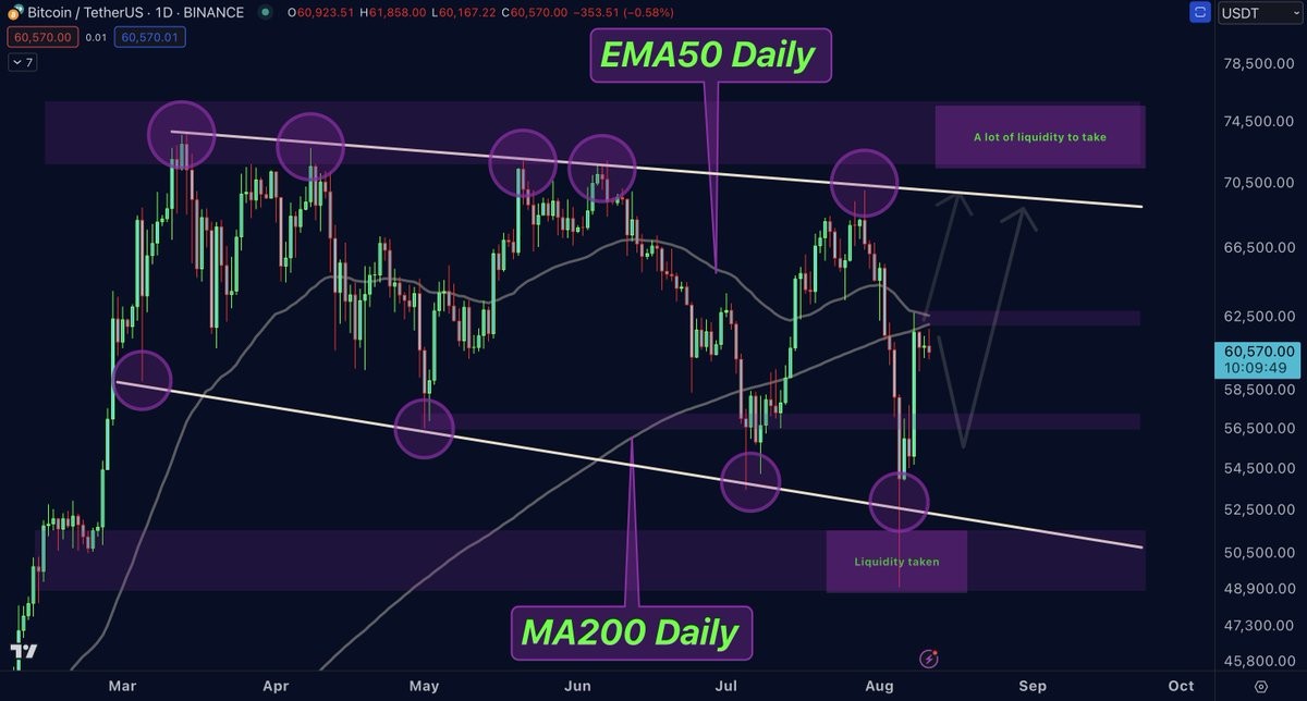 Он считает, что главной целью BTC остается диапазон $69-70 тыс. При этом Doctor Profit не исключает риск краткосрочного спуска криптовалюты до $54-55 тыс. Аналитик предупредил о том, что рынок на этой неделе может штормить на фоне выхода свежих данных по инфляции в США. Возможные сценарии движения BTC в ближайшее время он обозначил на графике.